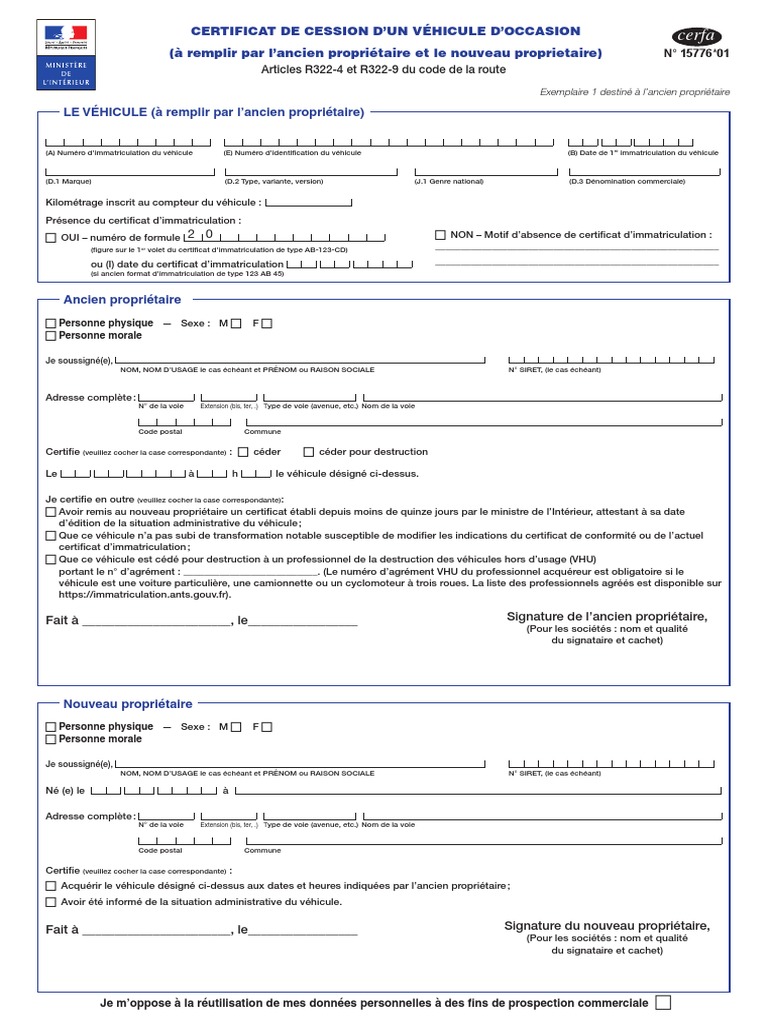Le certificat de vente dun véhicule doccasion. Le formulaire cerfa n1577601 remplace le formulaire n1375403 depuis septembre 2017.