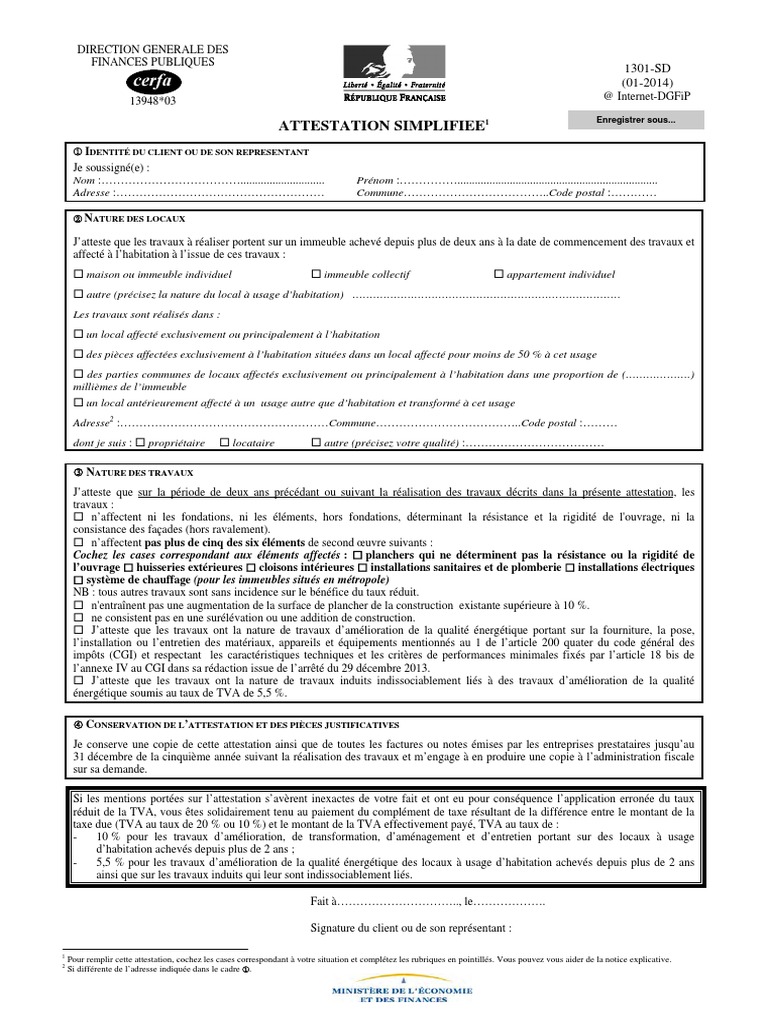 Formulaire n1301 sd tva attestation simplifiée taux réduit pour travaux logements de plus de 2 ans. Le bien peut être aussi bien la résidence principale ou secondaire que vous soyez propriétaires ou locataires. Attestation simplifiée garantissant les conditions prévues aux articles 278 0 ter et 279 0 bis du cgi pour bénéficier du taux réduit de la tva en matière de travaux sur les locaux à usage dhabitation de plus de 2 ans. En france il existe plusieurs taux de tva dont le taux réduit à 10 qui sapplique sur les travaux de rénovation sous certaines conditions. Direction générale des finances publiques n1301 sd not n5138305 09 2016 notice attestation simplifiee le taux réduit de tva de 10 prévu à larticle 279 0 bis du code général des impôts cgi sapplique sous certaines. Cerfa n 1394805 ministère chargé des finances autre numéro.