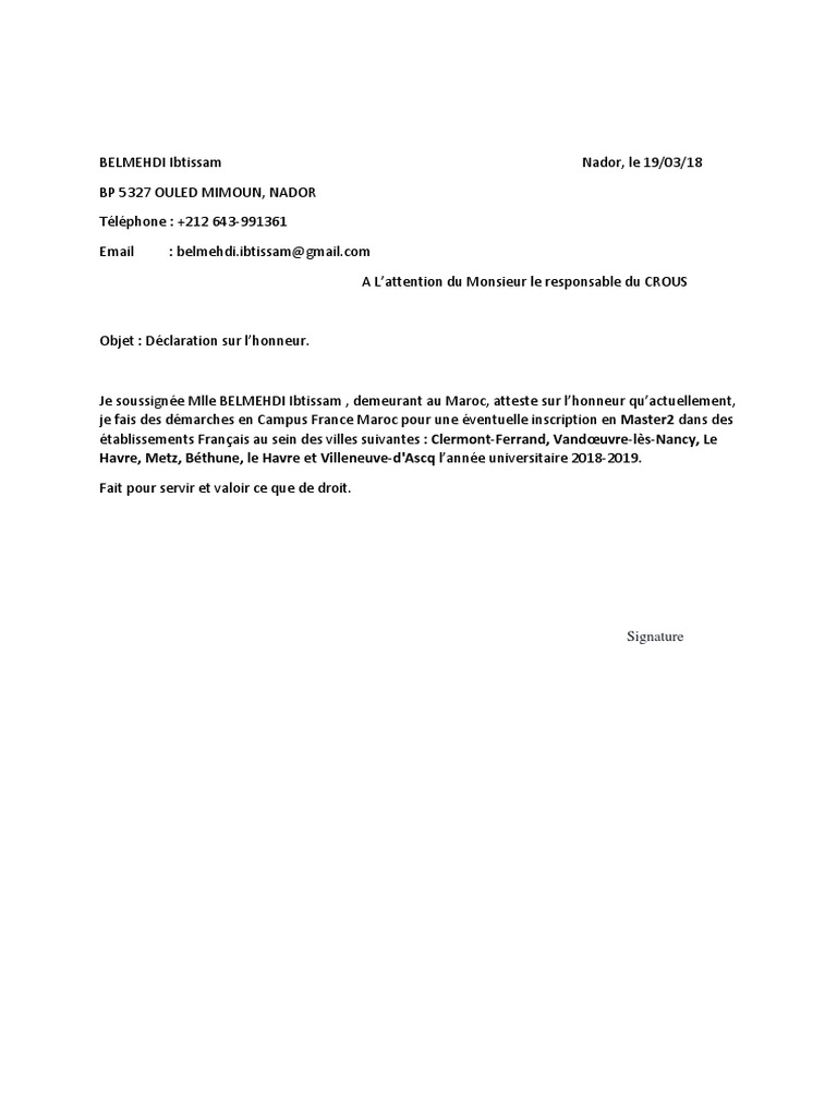 Attestation sur l honneur crous. Décrivez les faits ou circonstances à attester avec précision et exactitude jai pris connaissance des sanctions pénales encourues en cas de fausse attestation. Comment rédiger une lettre sur lhonneur modèle et quand vous sera t elle demandée info coronavirus. Voici un exemple type de lettre dattestation sur lhonneur que vous devez envoyer si vous ne pouvez pas encore fournir un justificatif étudiant ou si vous navez pas de ine. Conseils dutilisation du document en général le dossier de demande de bourse universitaire est composé dun justificatif des ressources des parents ou tuteurs et dune copie de certificat de scolarité de létablissement supérieur. Exemple dune attestation sur lhonneur pour crous avril 16 2017 exemple dune attestation sur lhonneur pour crous reviewed by unknown on avril 16 2017 rating. Si vous ne souhaitez pas ou ne pouvez pas modifier le document ci dessus via un logiciel de traitement de texte le jdn vous propose également de télécharger le modèle dattestation sur lhonneur au format pdf en cliquant sur le bouton ci dessous puis de limprimer et de compléter à la main les différents champs indiqués par des pointillés.