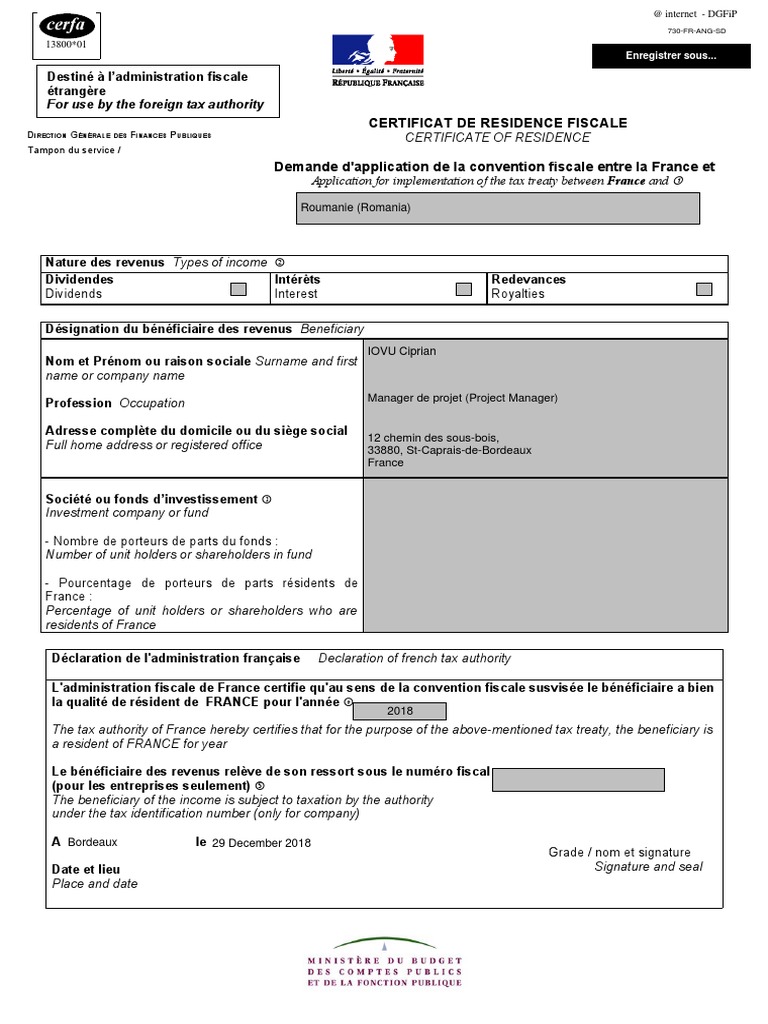 Certificat de r sidence france. Formulaire n5000 sd attestation de résidence destinée à ladministration étrangère. Déclaration sur lhonneur de son domicile cerfa n 1175202 premier ministre accéder au formulaire pdf 710 kb nouvelle fenêtre. Le formulaire cerfa 730 permet dattester de sa résidence fiscale en france auprès des autorités dun pays étranger. Il sagit du formulaire permettant dattester de la résidence en france du bénéficiaire auprès des administrations fiscales étrangères. Le certificat de résidence renseigne sur la domiciliation de lintéresséce document peut être demandé lors de la réalisation de certaines démarches administratives. Plus dinformations sur le site des douanes.
