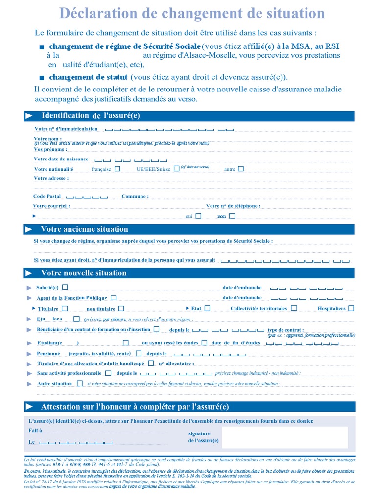 Si en revanche vous changez de. Ayant fait le changement de situation auprès de la sécurité sociale votre dossier sera mis à jour. Changement de situation professionnelle sera mise à jour. Vous devez signaler tout changement de domicile au centre de sécurité sociale de votre ancien domicile. Vous serez alertée par courriel dès que la page sécurité sociale. Pour les changements de situation entraînant un changement de régime de sécurité sociale par exemple si vous étiez au rsi et que vous passez au régime général en devenant salarié alors vous devrez utiliser le formulaire de demande de mutation n 750 cnam.