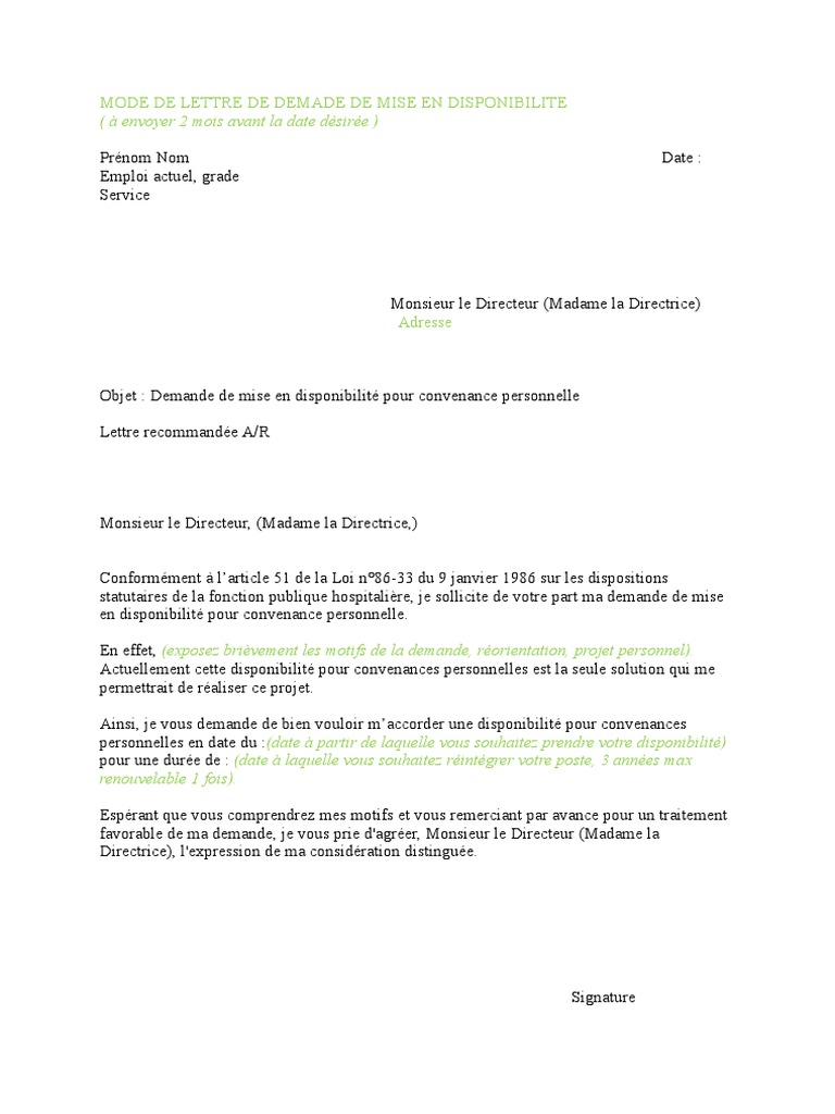 En effet exposer sans trop de détails des motifs de la demande. La disponibilité des agents de la fonction publique hospitalière. La disponibilité est la situation de lagent qui se trouve placé temporairement hors de son administration ou service dorigine et qui cesse de bénéficier durant cette période de sa rémunération et à la retraite.