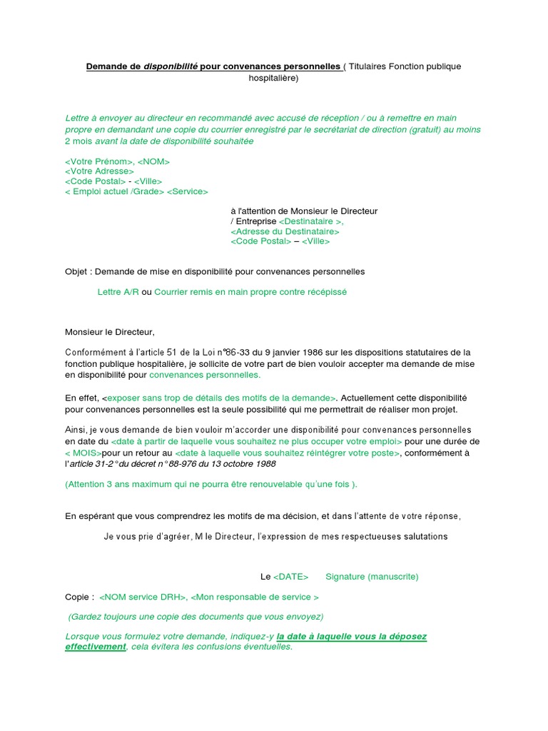 Disponibilit fonction publique hospitali re. Lunsa fonction publique passe en revue les nouvelles dispositions liées au décret dapplication dont le projet a été soumis au ccfp du 12 novembre 2018 et publié le 28 mars 2019. Sauf dans le cas dune disponibilité de droit ladministration peut. Prénom nom adresse personnelle service daffectation grade ville le date à lattention de autorité ayant le pouvoir de nomination sc des différents responsables hiérarchiques. Fonction publique hospitalière je sollicite de votre part de bien vouloir accepter ma demande de mise en disponibilité pour convenances personnelles. Il fixe les conditions de mise en œuvre du maintien des droits à lavancement durant la disponibilité et modifiera la disponibilité pour convenances personnelles. Doffice de droit pour convenances personnelles 14 juillet 2013 pas de commentaire la disponibilité est la position du fonctionnaire qui placé hors de son établissement cesse de bénéficier dans cette position de ses droits à lavancement et à la retraite ainsi que de sa rémunération.