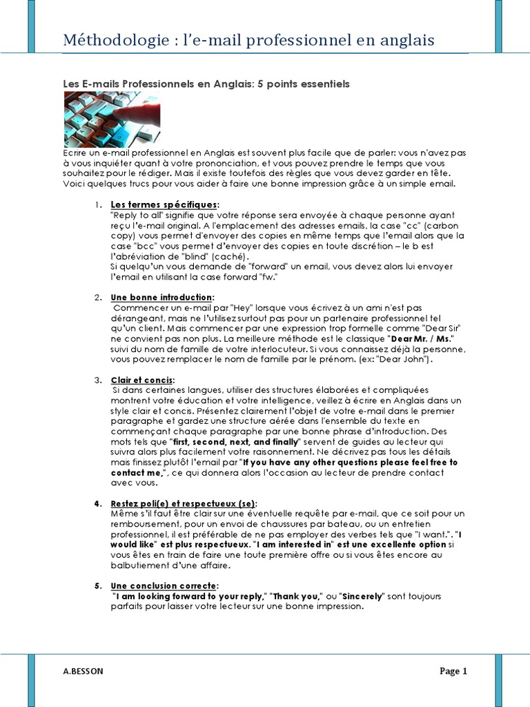 Ecrire un e mail en anglais avec un ton soutenu et professionnel nest pas facile. Les règles à suivre. Si lon décide de rédiger un email en anglais cest souvent avec les formules servant à commencer et à finir le message que lon doute le plustout comme en français il existe en effet des formules courantes quil est bon de pouvoir écrire. Le mail est devenu un mode de communication incontournable. Et vous ne pouvez traduire mot pour mot du français à langlais au risque dutiliser des tournures maladroites. Rédiger un e mail en anglais est un exercice souvent périlleux dans le cadre de ses activités professionnelles.