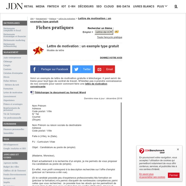 Vous pouvez aussi le copier coller pour lutiliser dans un mail. Vous trouverez dans cette fiche un exemple de lettre de motivation à télécharger. 15 exemples de lettres de motivation afin de vous aider à rédiger votre lettre de motivation. La lettre de motivation complète votre cv et. La lettre de motivation ou la mail de motivation nest pas remisée parmi les accessoires inutilisés et reste un élément fondamental de la candidature. Vous pouvez le télécharger et le modifier dans un logiciel de traitement de texte.