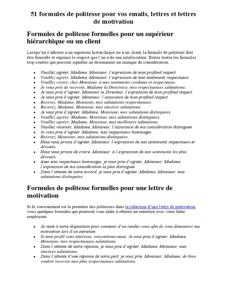 Quel que soit le type de lettre et quelle que soit la personne à qui la lettre est destinée il est important dinsérer une formule de politesse dans une lettre qui reprend le titre de civilité de lentête de la lettre. Lorsquon sadresse à un supérieur hiérarchique ou à un client la formule de politesse doit être formelle et exprime le respect que lon a de son interlocuteur.