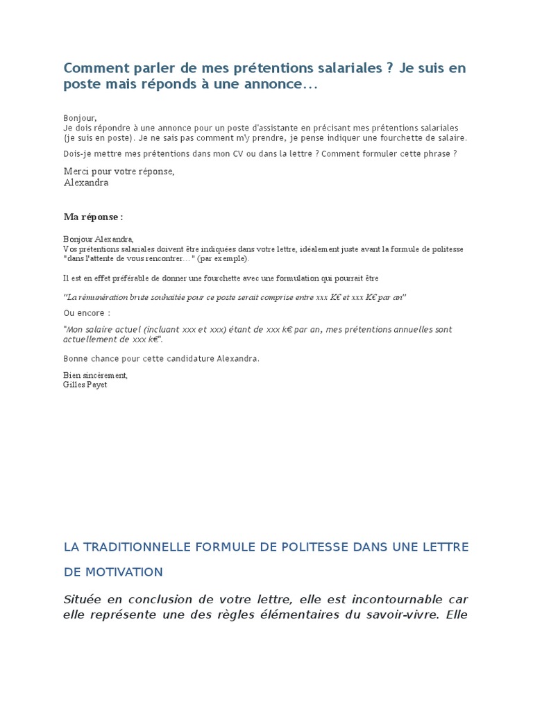Lettre de motivation. La lettre de motivation et autres courriers administratifs sont bien standardisés les formules de politesse encadrant celles ci sont très importantes à respecter pour donner une bonne. Il est possible de rester très classique ou bien de travailler quelque peu cette dernière phrase pour se distinguer. Alors prenez votre temps pour rédiger vos lettres de motivation et autres emails de candidature. Lorsquon sadresse à un supérieur hiérarchique ou à un client la formule de politesse doit être formelle et exprime le respect que lon a de son interlocuteur. Fin de lettre de motivation.