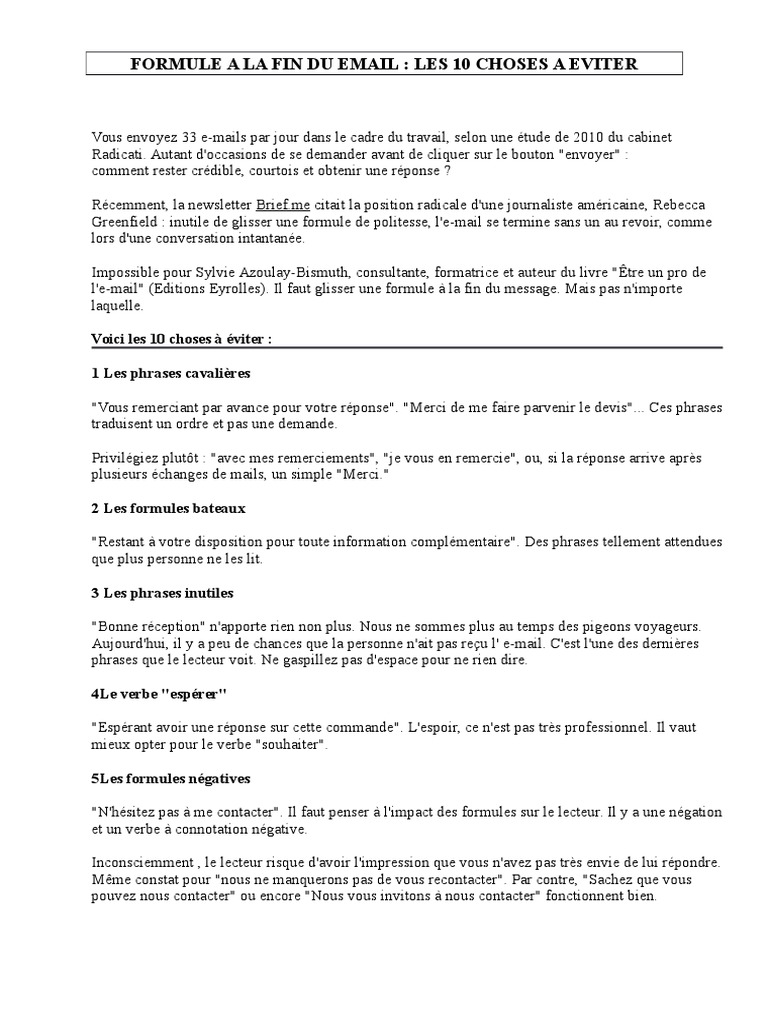 Formule de politesse fin de mail. Cest le rôle de la formule de politesse. Lidée est de toujours conclure. Même si son utilité reste à démontrer la formule de politesse savère indispensable dans toutes les correspondances cest une courtoisie de la langue française qui varie selon lobjet du courrier et la nature de la relation quon entretient avec le destinataire. La formule dappel sert à ouvrir le. Formule de politesse mail. Par exemple pour débuter la rédaction dun mail il faut éviter lutilisation du mot bonjour.