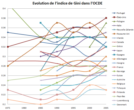 Indice de gini france. Los datos se basan en datos primarios obtenidos de encuestas de hogares de los organismos de estadística del gobierno y los departamentos de país del banco mundial. Autrement dit il mesure le niveau dinégalité de la répartition dune variable dans la population. Lindice de gini augmenterait de 0005 pour sétablir à 0294 et le ratio entre la masse des niveaux de vie détenue par les 20 de personnes les plus aisées et celle détenue par les 20 les plus modestes augmenterait de 01 pour sétablir à 44. Cest en 1984 quon enregistre la valeur la plus élevée 3837 et cest en 2006 quon enregistre la valeur la plus basse 2992. índice de gini france. Entre 0 et 1 linégalité est dautant plus forte que lindice de gini est élevé.