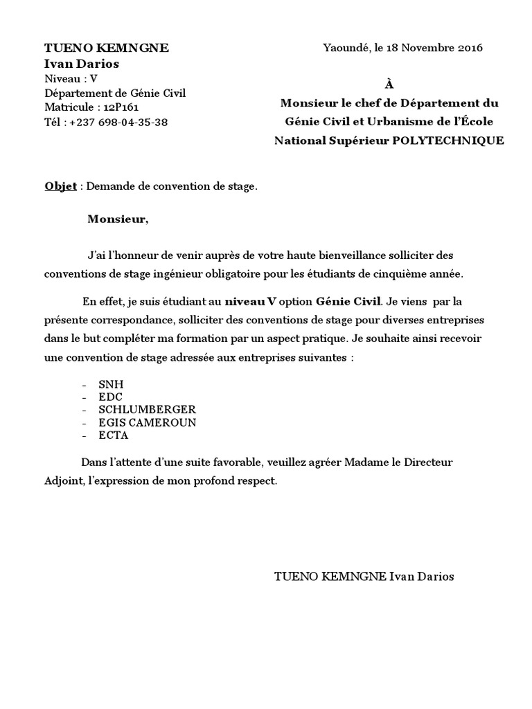 Demander quelque chose à un supérieur à une autorité. Jai lhonneur de solliciter de votre bienveillance de bien vouloir accepter ma candidature au sein de votre établissement. Je souhaite vivement effectuer au sein de votre entreprise un stage pour enrichir mes connaissances. Jai eu la surprise de constater que. Motivé et désirant profiter de lexpérience de votre centre en matière de kinésithérapie vous me trouverez toujours attentif efficace et patient. Jai lhonneur de solliciter de votre haute bienveillance lobtention dun stage au sein de votre entreprise.