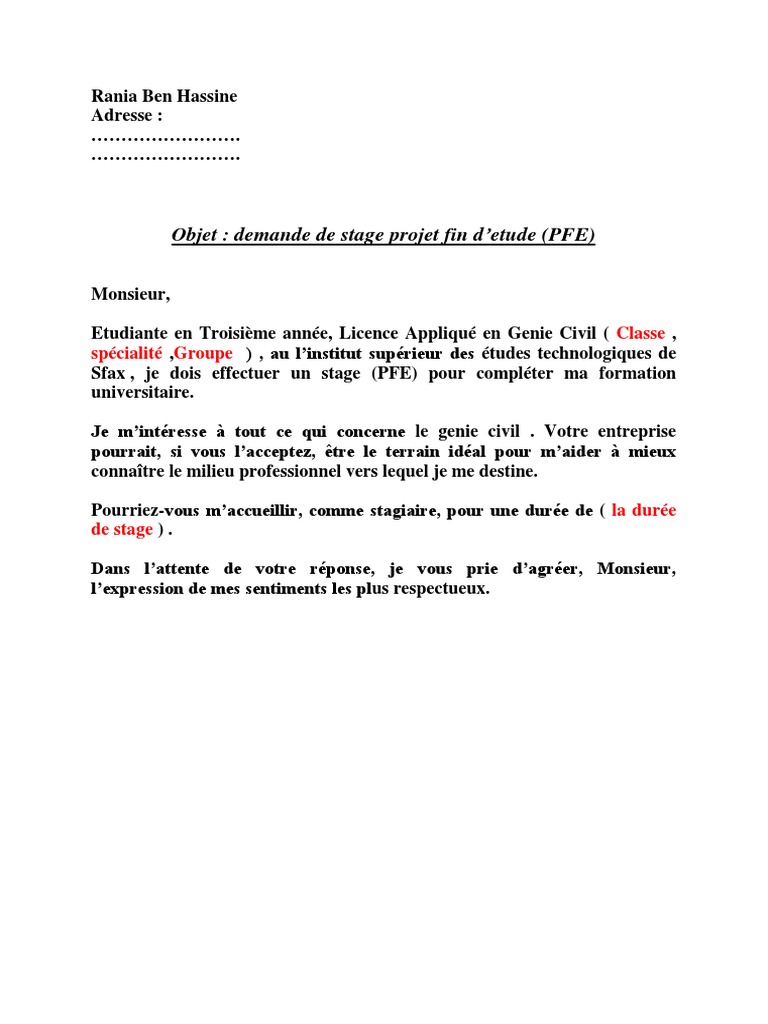 Télécharger une lettre de motivation pour stage de fin détude stage durant lété stage étudiant ou stage avant emploi. Actuellement je suis en troisième année pour un diplôme supérieur de technologie en génie des systèmes industriels et génie de lenvironnement hygiène et sécurité à est l de pointe noire congo.