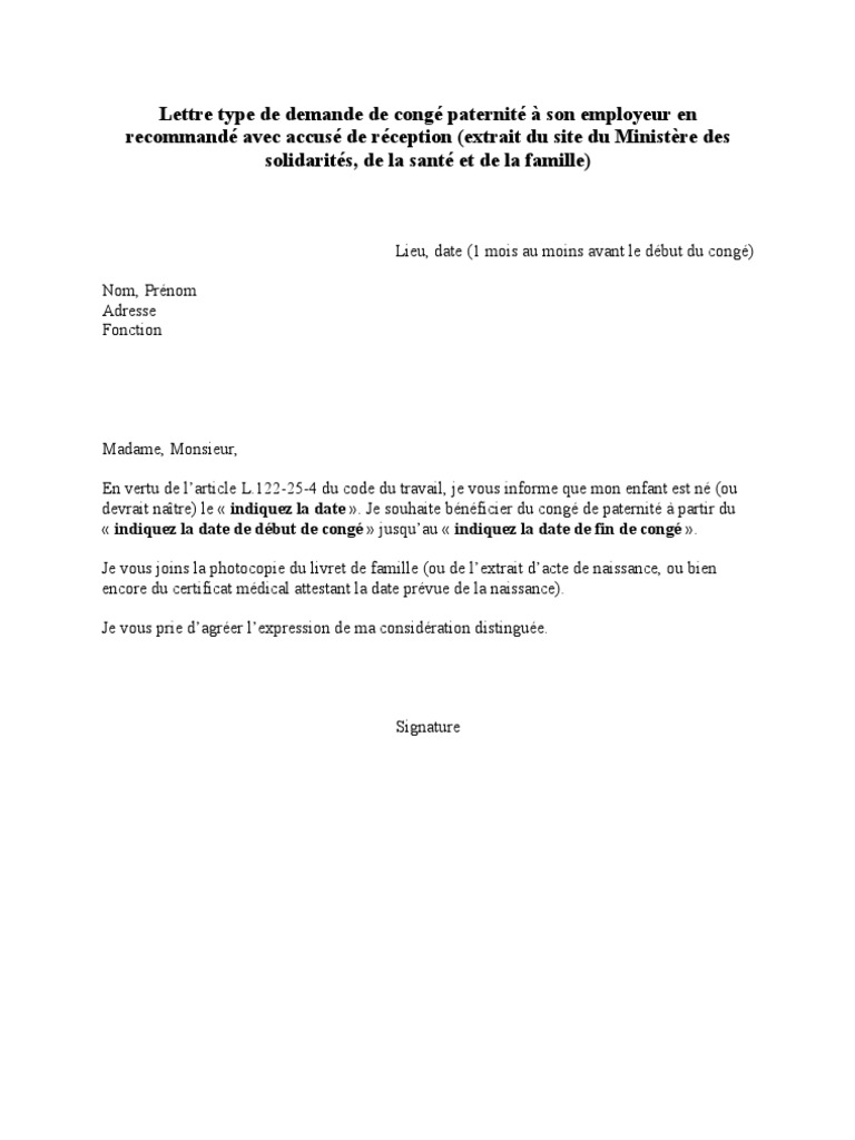 Si le congé parental débute plus tard lemployeur. Une lettre de demande de congé parental doit respecter certaines règles de forme. Ce modèle de lettre peut aussi servir pour différents types de congés. Pour bénéficier dun congé parental il suffit den faire la demande auprès de son employeur par lettre recommandée avec accusé de réception ou par lettre remise en main propre contre déchargevotre lettre doit préciser la date de début du congé parental sa durée mais également sil sagit dune demande de congé parental total. Si le congé parental débute immédiatement après le congé de maternité ou dadoption lemployé doit en informer lemployeur au moins 1 mois avant le terme du premier congé. Vous souhaitez vous consacrer davantage à léducation.
