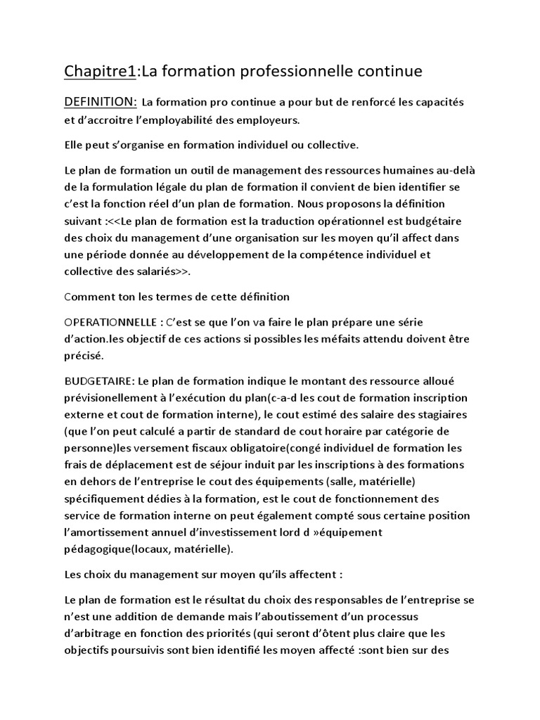 Le plan de formation peut comporter 3 catégories regroupant. La formation professionnelle est généralement. La formation continue permet aux personnes actives de continuer à se former tout au long de leur carrière professionnelle pour suivre lévolution des techniques développer leurs compétences et ainsi favoriser leur adaptation aux besoins de lentreprise et au monde du travail en général. Les actions visant à assurer ladaptation du salarié au poste de travail les actions liées à lévolution des emplois ou participant au maintien dans lemploi les actions ayant pour objet le développement des compétences des salariés. Voir le plan de développement des compétences évolution du plan de formation depuis le 1er janvier 2019. Ensemble des mesures adoptées en vue de lacquisition ou du perfectionnement dune qualification professionnelle pour les travailleurs prises en charge en france par létat et les employeurs.