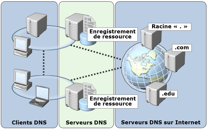Qu est ce qu un serveur dns. Votre serveur dns une fois quil dispose de ladresse ip du serveur dns de lautre domaine lance une requête auprès de ce serveur pour obtenir l conversion du nom de domaine en adresse ip. Pour pouvoir attribuer manuellement ladresse du serveur dns cliquez sur utiliser les adresses de serveur dns suivantes et entrez ladresse du serveur dns alternatif. Votre résolveur interroge donc ensuite ce serveur 4 sur le schéma cest celui qui va savoir quelle est ladresse du serveur dns suivant celui qui sera capable finalement de vous renseigner et de vous fournir lip liée au nom de domaine point 5. Si ce nest pas le cas vous devez noter ladresse du serveur dns utilisé avant de changer ladresse du serveur de manière à pouvoir revenir aux anciens paramètres en cas de besoin. Le serveur dns local renvoie ensuite information à la machine qui la réclamée. Le serveur dns de niveau 1.