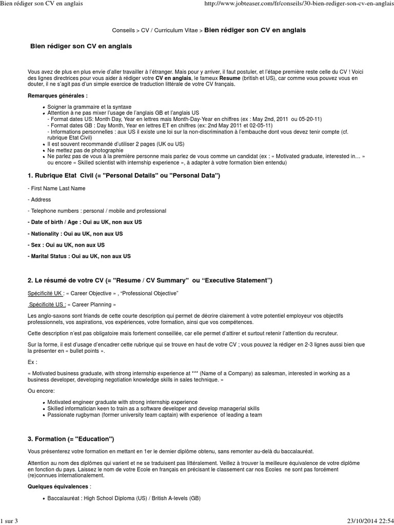 Pour partir travailler à létranger on doit être capable de rédiger son cv en anglais. Commencez à entrer vos renseignements personnels. Voici quelques conseils résumés sous forme. Il est important dadapterla rédaction de ton cv en anglais par rapport au pays auquel tu souhaites postulerlanglais des états unis nest pas le même que celui du royaume uni ou de laustralie. Voici quelques conseils pour vous aider à rédiger un cv en anglais qui sort du lot. Lors de la rédaction dun cv en anglais il est vivement conseillé dindiquer son niveau de langue.