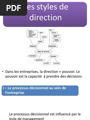 Les styles de direction chapitre 1 management tstmg duration. La personnalité et les caractéristiques du dirigeant la taille de lentreprise la propriété de lentreprise lenvironnement de lentreprise. Dans les entreprises publiques des objectifs comme le service public et lintérêt général modifient. Ce style est un système de direction démocratique dans lequel le dirigeant va prendre connaissance des idées et suggestions que lensemble du personnel peut émettre avant de prendre toute décision. Les styles de direction selon likert style autoritaire exploiteur. Les décisions et le processus de décision toute entreprise en fonction de ses finalités met en place un management stratégique et opérationnel.