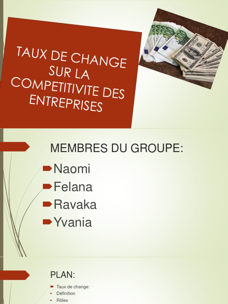 Le taux de change est un cours qui indique la valeur dune monnaie par rapport à une autre. Dans les banques les opérations de change sont réalisées par les cambistes. Le plus important de ces taux de change est la parité eurodollar. Le taux de change désigne le rapport des monnaies les unes aux autres. Il sexprime généralement en un coefficient multiplicateurpar exemple si lon parle du rapport entre le yen et leuro on dira 1 euro 141 672 yensle taux de change permet de jouer sur la compétitivité des pays en matière d. Le taux de change est la valeur dune devise par rapport à une autre.
